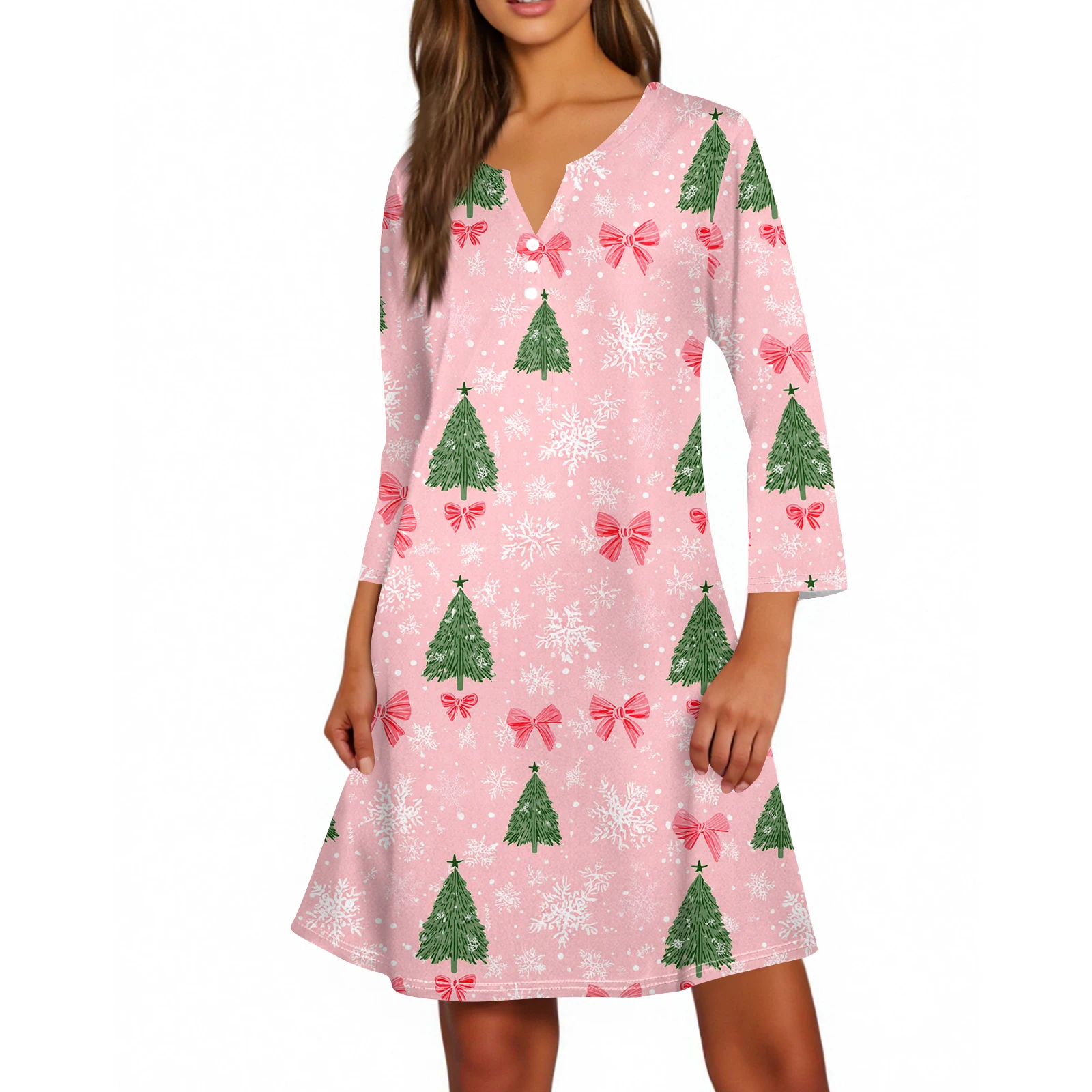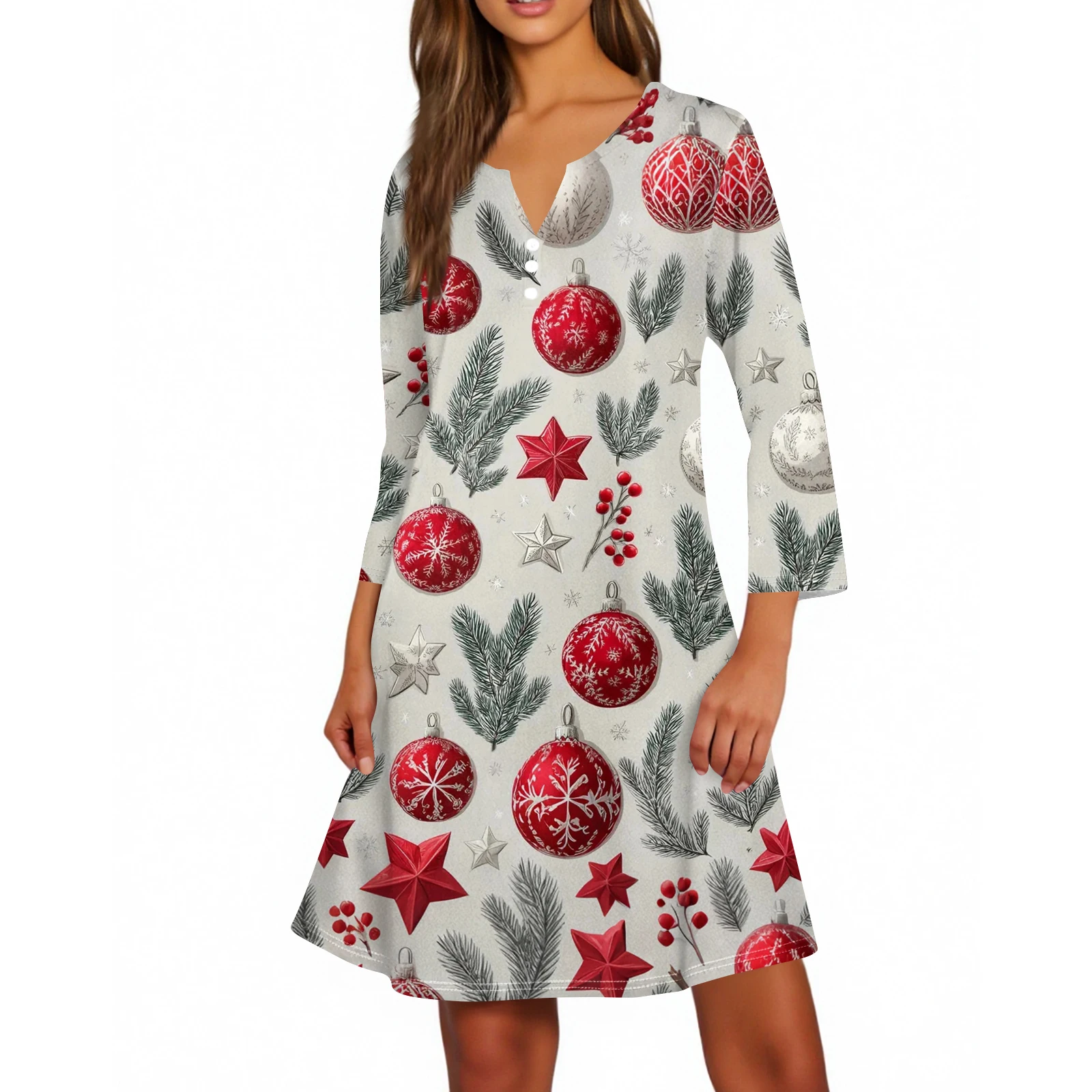 Women’s Christmas Printed V-Neck Dress with Buttons & Pockets – Holiday Fashion Long Sleeve Dress